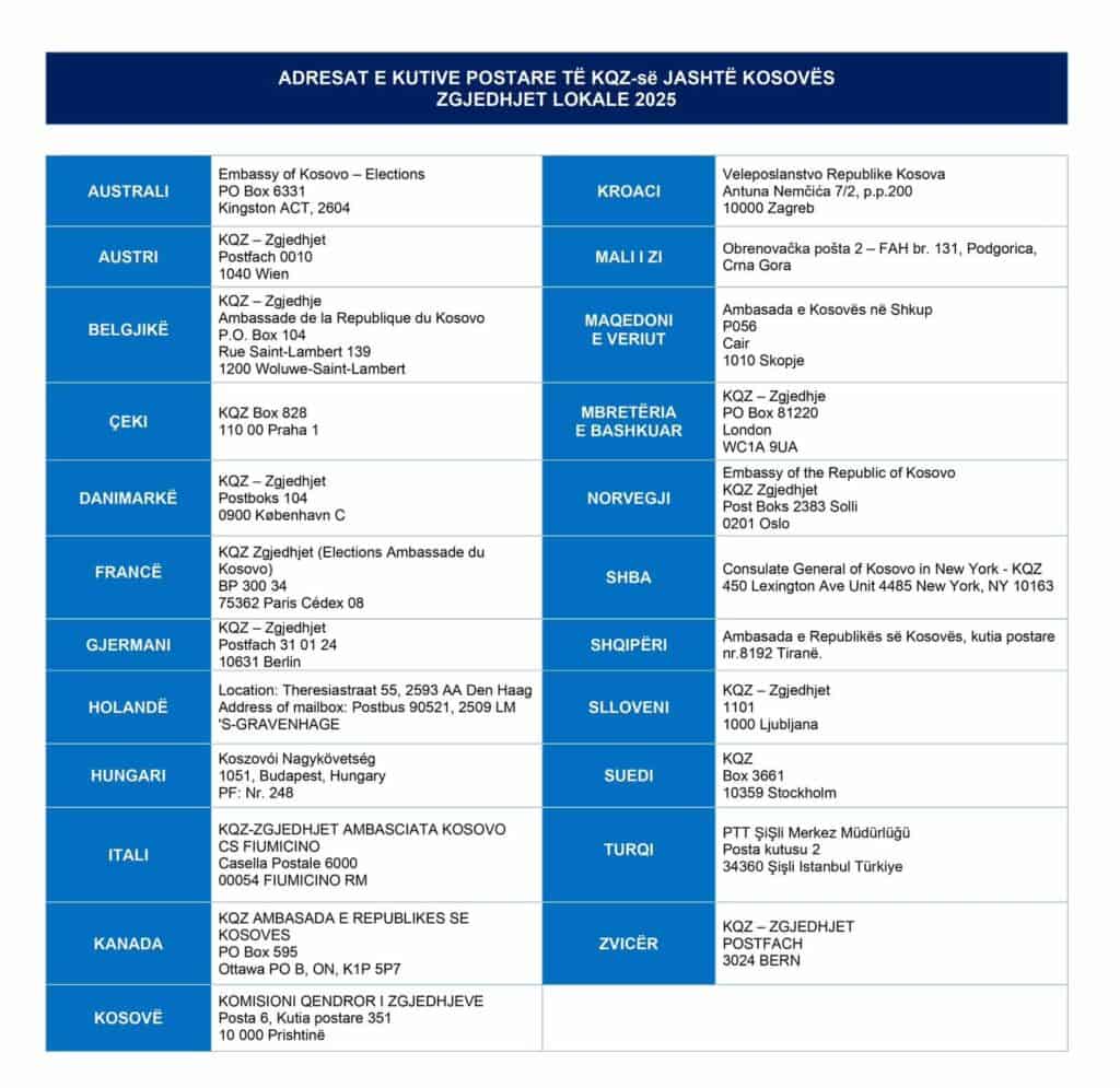 Me qëllim të ofrimit të mundësisë për votim për shtetasit që janë regjistruar për të votuar përmes postës, KQZ bëri të ditur se kutitë postare janë funksionale në këto shtete: Australi, Austri, Belgjikë, Çeki, Danimarkë, Francë, Gjermani, Holandë, Hungari, Itali, Kanada, Kosovë, Kroaci, Mali i Zi, Maqedonia e Veriut, Mbretëria e Bashkuar, Norvegji, ShBA, Shqipëri, Slloveni, Suedi, Turqi dhe Zvicër.